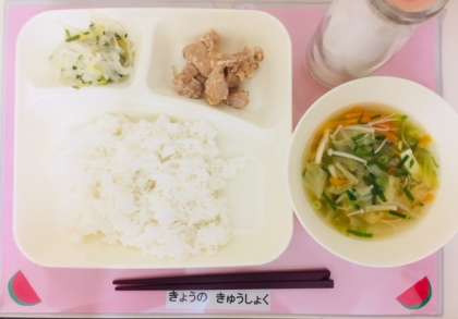 「切り干し大根のゆずの香あえ」は、切り干し大根をよく洗って下茹でし、ゆず果汁を加えて作った甘酢と一緒にあえています。爽やかな香りと酸味で、蒸し暑い季節にぴったりの献立です。