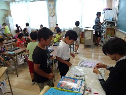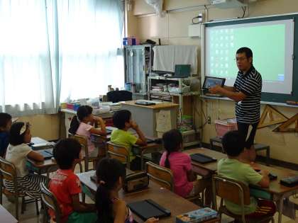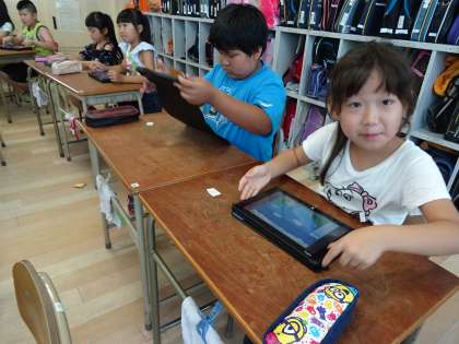 先生の説明をしっかりと聞き、子ども達は慎重に操作をしていました。友だちと操作を確認しあう様子も見られ、子ども達は早くタブレットに慣れようと意欲的に取り組んでいました。