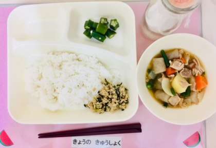 「ツナっ葉いため」は、ツナと大根葉を炒めてから、料理酒と醤油で味付けをしています。大根葉に含まれるビタミンやミネラル、ツナのタンパク質が合わさったバランスの良い献立です。ご飯に良く合う味付けで、子どもたちにも大好評でした。