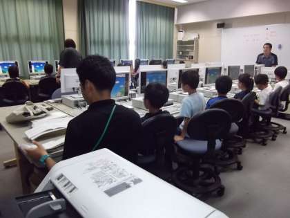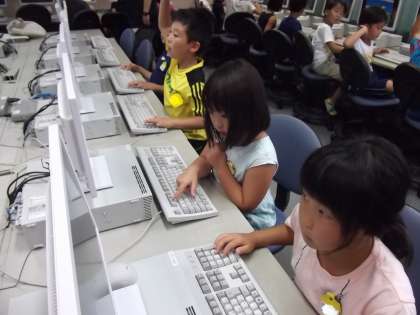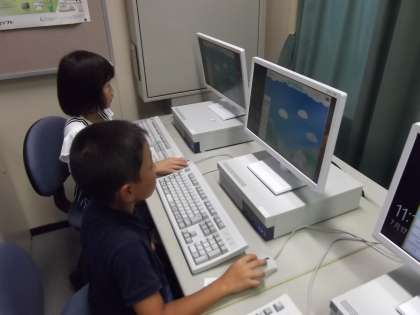 2年生はパソコン教室で初めての学習をしました。今日は、マウスのクリックのしかたや、キーボードの入力方法など、基本的な使い方を練習しました。その後、パスワードを入力してログオンしました。初めてふれる子どもは緊張していましたが、友だちと一緒にキーボードを打ち、操作することができました。