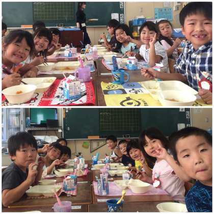 鶏肉と里芋の煮物は、下茹でをしてぬめりを取った里芋と、玉ねぎ、人参、厚揚げなどが入った具だくさんの煮物です。色々な具材から出た旨味が合わさって、出汁まで美味しく食べることができ、子どもたちに大好評でした。