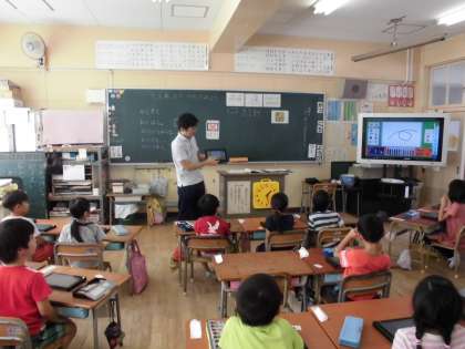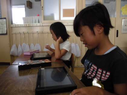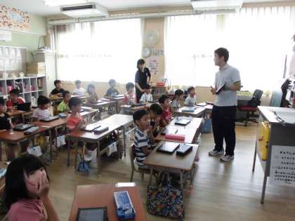 1年生ははじめてタブレットの操作につて学習しました。前半はタブレットの起動の方法や、基本的な操作、パスワードの大切さを教えてもらいました。後半はお絵かきソフトを使って、絵をかいたり、スタンプを押したりしました。楽しく活動していました。