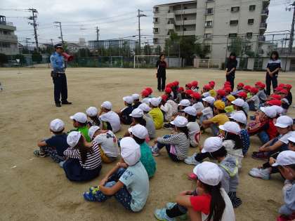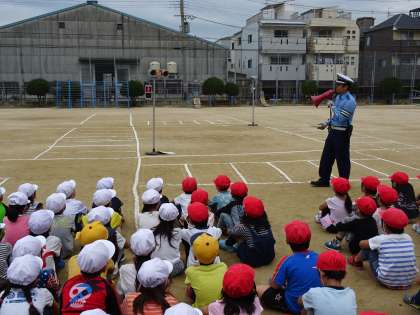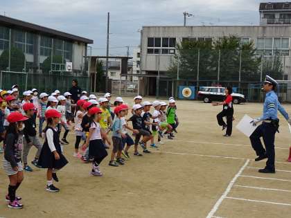 1・2・3年生は交通安全教室として、平野警察署から警察官の方々に来ていただき、正しい歩行の仕方や交通ルールなどについて教えてもらいました。