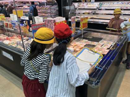 社会の学習で地域のスーパーマーケットに行きました。事前の学習で考えた「知りたいこと」「疑問に思っていること」を質問しました。店内では、店の工夫や従業員さんの仕事をみて気づいたことをワークシートにまとめました。