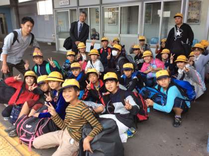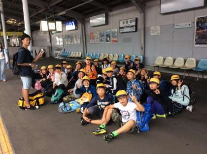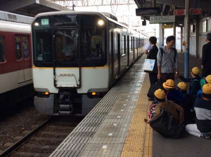 近鉄俊徳道から団体電車に乗りました。電車の中では、おやつを食べたり、カードゲームをしたりして、友だちと楽しく過ごしています。