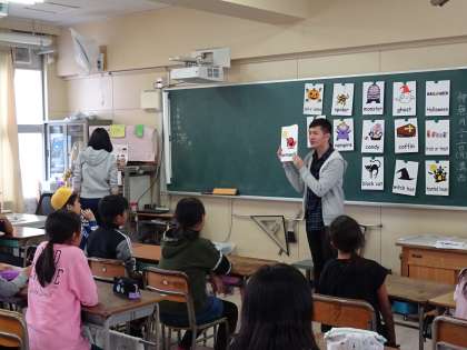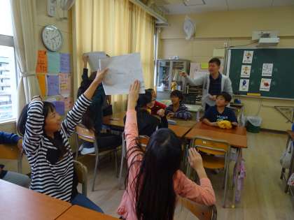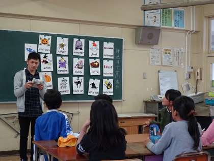 5、6年生の活動の様子です。テーマはハロウィンでした。"This is black." "This is animal."など、3つの英語のヒントを聞いてどの単語かをあてる3ヒントクイズを行いました。そのあと、"Boo-yah"という、キーワードを大きな声で発音するゲームをしました。
