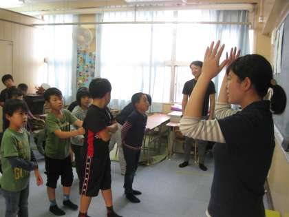 "If you're happy and you know it, clap your hands"という歌を振りをつけて歌いました。
