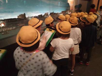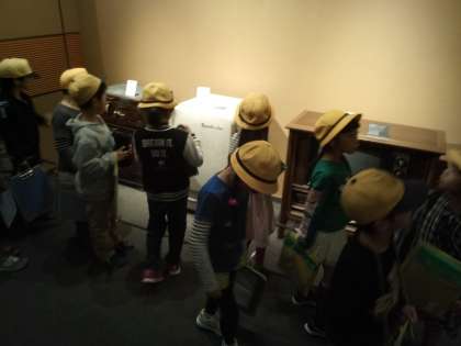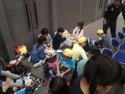 活動の様子です。お弁当を食べているところと展示を見学しているところです。