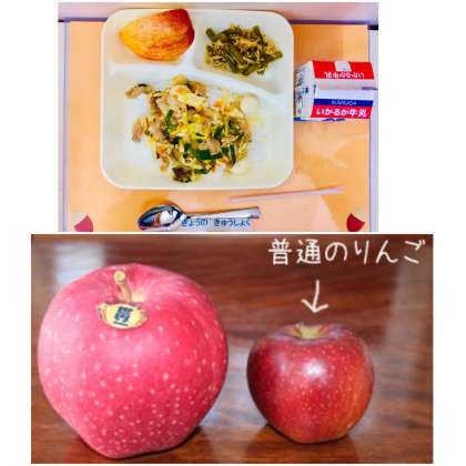 今日の給食のりんごは「シナノスイート」という品種で、今が一番おいしい時期です。「甘くて美味しい!」と大好評でした。