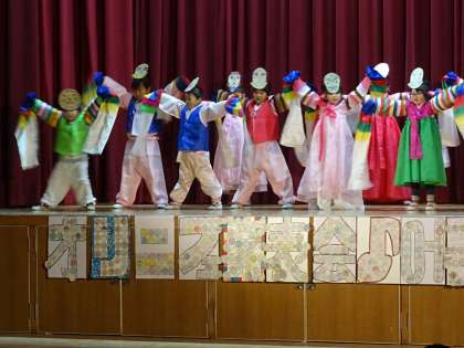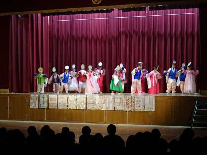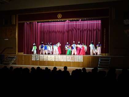 最初の演目は、低学年による「タルチュム」をしました。タルは〈仮面〉チュムは〈踊り〉という意味です。仮面は自分たちで色を塗って作りました。踊りの時に両手につけるものは、ハンサンというもので、踊りを大きく見せたり美しく見せたりする役目をしています。