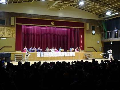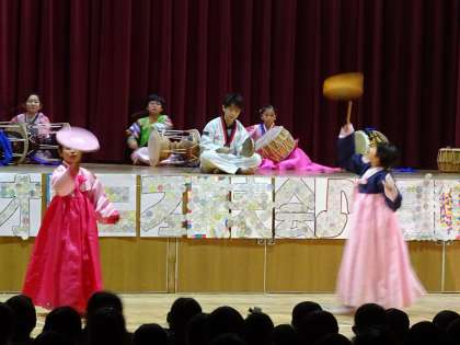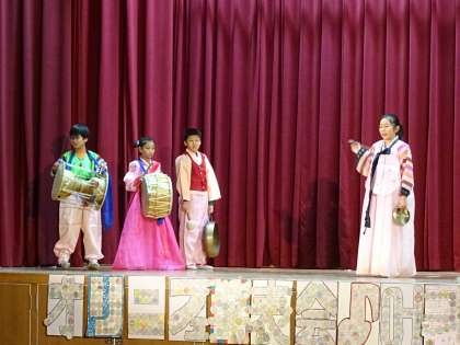 サムルノリとはケンガリ・チン・チャング・プクを用いた韓国の現代音楽のことです。みんなで息を一つに合わせて演奏し、演奏の中には、「ボナ」と言われる皿回しのようなものや「サンモ」と言う帽子回しにもチャレンジしました。