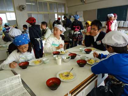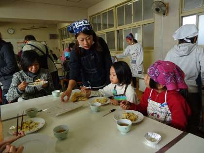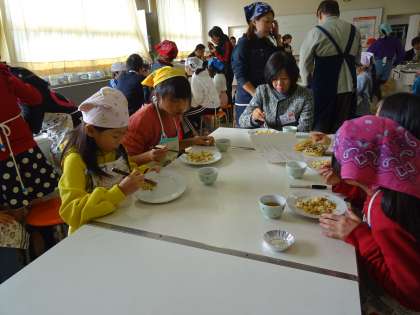 子ども達は出来上がった料理をゲストティーチャーの方々と一緒に喫食し、日本料理との共通点や相違点など考えながら食べていました。