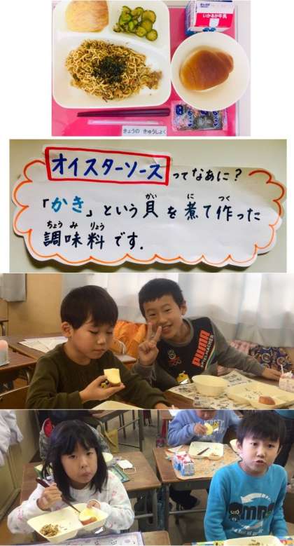 オイスターソース焼きそばには、オイスターソースの他に、テンメンジャンと濃口醤油、塩、こしょうを使って味付けしています。コクのある味付けで、子どもたちからは「いつもの焼きそばとは違うけど、美味しかった!」と、好評でした。