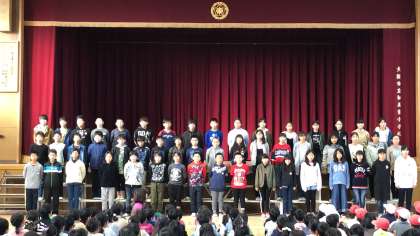 交流会に行く前に講堂で最後のリハーサルをしました。1年生やたくさんの先生方が見守る中、6年生の子ども達は精一杯の発表をし、見ていた人たちからたくさんの拍手がおくられていました。