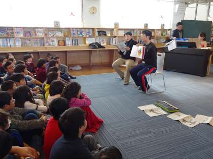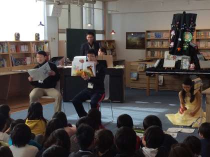 高学年の鑑賞会では、先生が英語の本の読み、その場面にあわせて音をならしたり曲を弾いたりした、読み聞かせをしてもらいました。