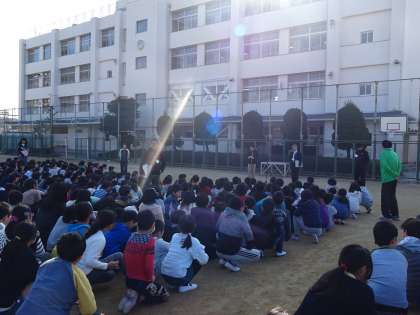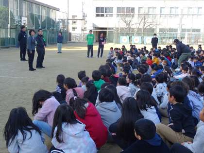 今日の訓練では、平野警察署から警察官の方に来校していただき、防犯訓練の様子を見ていただきました。不審者対応への教職員の連携、子ども達のスムーズな避難など、随所によかった点を警察官の方に称賛していただきました。