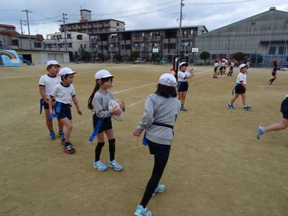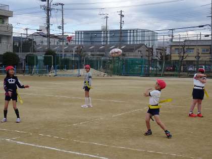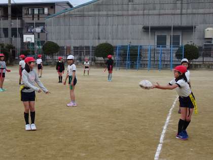 またグループに分かれて、ボールを使ったパス練習もしました。慣れないラグビーボールを使っての練習に戸惑いながらも楽しそうに活動をしていました。