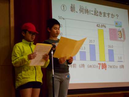 睡眠アンケートの結果では、低学年は9時30分頃に寝ていますが、高学年は11時頃に寝ている人が多いことがわかりました。