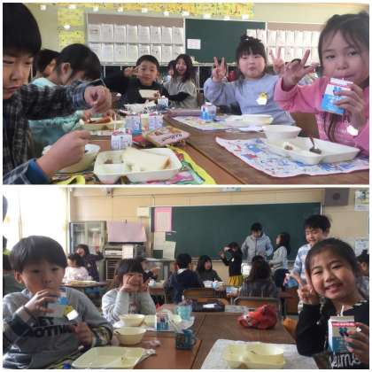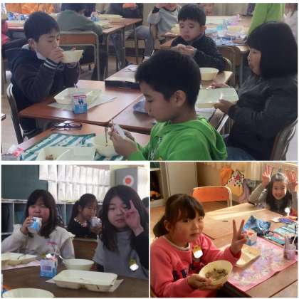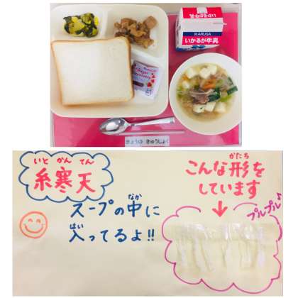 糸寒天のスープは、豚肉、野菜、豆腐、糸寒天を使い、具だくさんで中華風のスープに仕上げています。給食に使用している糸寒天は、スープに入れて煮ても食感が程よく残る物を使っているので、子どもたちは、「ツルツルしてるけど、噛んだらプチプチしてる!」と、楽しそうに食べてくれていました。