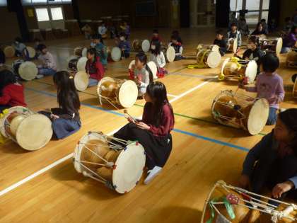 ソンセンニㇺに来ていただいて、韓国・朝鮮の楽器などのお話をしていただいた後、楽器やサンモなどの体験をさせていただきました。