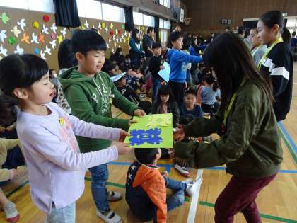 在校生のみんなからのメッセージが6年生に贈られ、6年生からはぞうきんのプレゼントがありました。