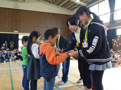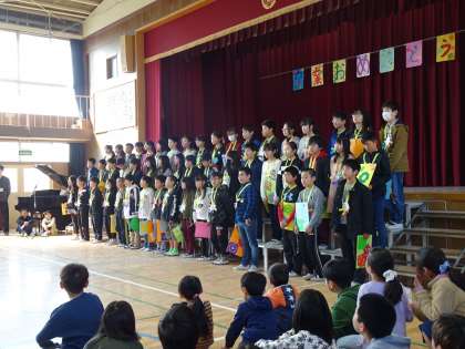 プレゼント交換の後、6年生からの呼びかけと合唱の発表がありました。気持ちのこもった呼びかけや歌を、在校生のみんなは真剣に聞いていました。