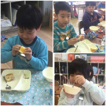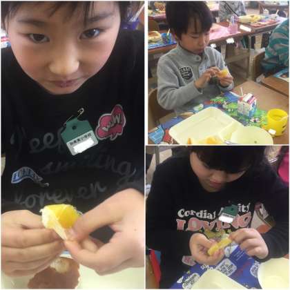 はっさくは、厚い皮を剥いたり、中袋から果肉を取り出すために、指先の力を使いますが、自分たちで工夫しながら上手に剥くことができていました。