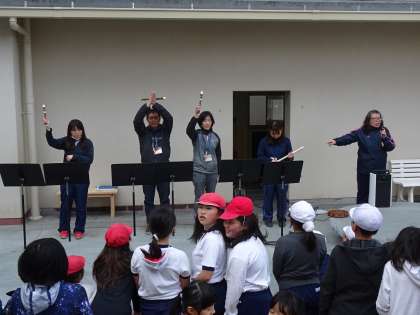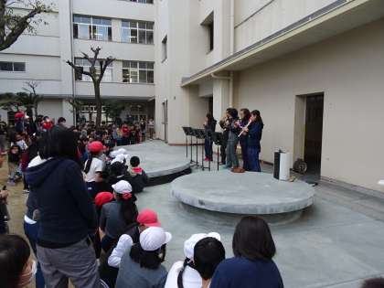 休み時間に中庭でリコーダー演奏会がおこなわれ、前回のセレモニーに続いて、多くの子ども達が集まっていました。