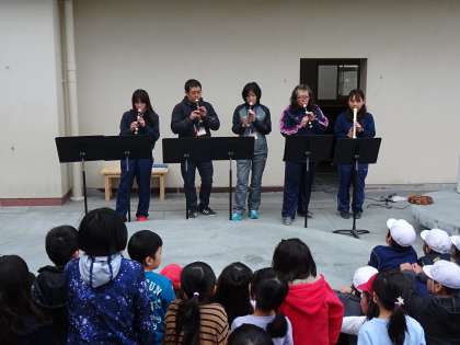 最初にリコーダーの種類について紹介があった後、先生たちのリコーダーの演奏が披露されました。子ども達がよく知っている人気の曲ということもあり、歌ったり踊ったりしている子ども達の姿も見られ、会場はとても盛り上がっていました。