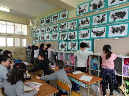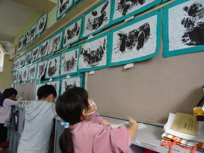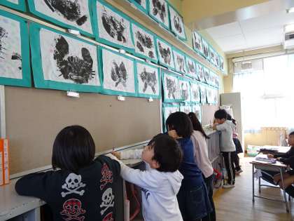 子ども達は版画で作ったニャーゴの作品を一つずつじっくりと見て感想を書いたり、友達の作品のいいところを書いたりしていました。