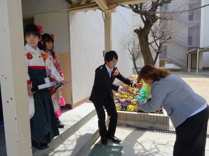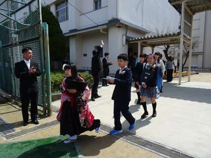 卒業式が終わった後、5年生、保護者、来賓の方々、教職員で花道をつくりました。
