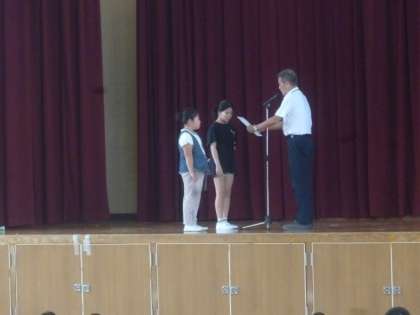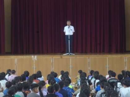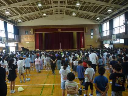 2学期の始業式では、校長先生から「親切な学校」にしようとお話がありました。次に図工の作品の表彰がありました。最後には、ピアノ伴奏に合わせて校歌を歌いました。とても元気で素敵な歌声でした。