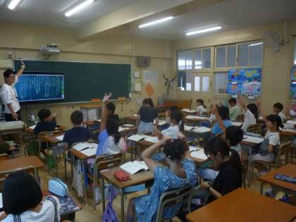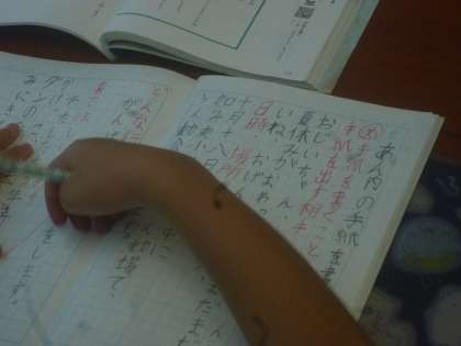 お母さんに渡す運動会の案内の手紙を、ノートを見ながら原稿用紙に下書きとして写していました。