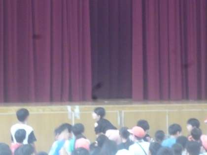 舞台の幕の間から通るものを当てるゲームです。フラフープ、サッカーボール、黒板消し‥と続き、最後は人。それは校長先生で、歓声が上がりました。