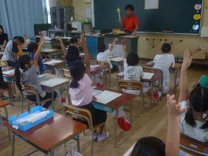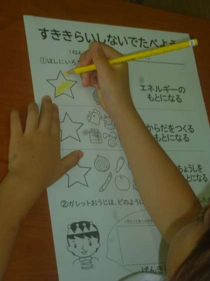 2時限目、ガレットおうじの紙芝居を見た後、赤・黄・緑の三色栄養についてプリントに色ぬりをしました。3時限目は2組で同じ内容の授業をしました。