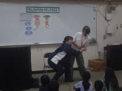 2時限目多目的室で、「NPO法人エンパワーメントいばらき」の方が来られ、寸劇を通して危険な場面に会った時の行動の仕方などを学習しました。実際に児童が前に出て体験することができました。