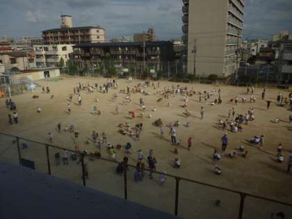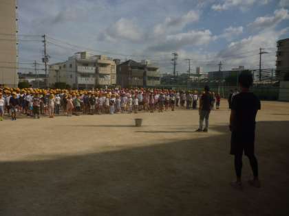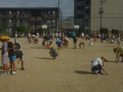 運動会に向けて来週から運動会練習が始まります。今日は運動場の石拾いを全校児童で行いました。拾った石はバケツに入れていきました。