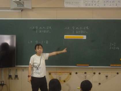 「バスに9ひきのっています 1ぴきおりました」 9−1=8