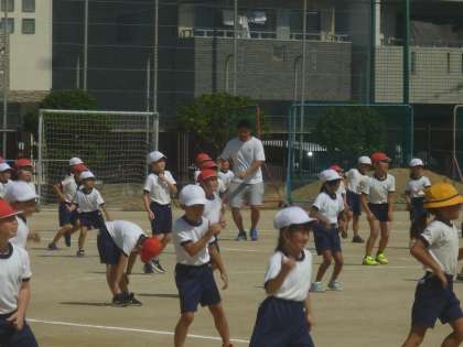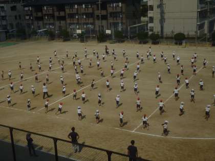 3時限目、1・2年合同による団体演技の練習がありました。さわやかな秋空の下、運動場でせいいっぱいの演技を行っていました。動きもしっかり身についてきたようです。