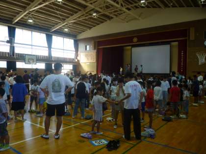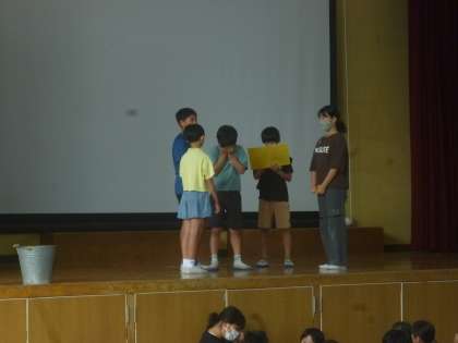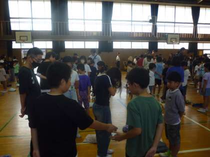 班で円になり宝ものを順に回していき、音楽が止まった時に誰が持っているかを当てるゲームです。顔の表情などから見つけようとがんばっていました。