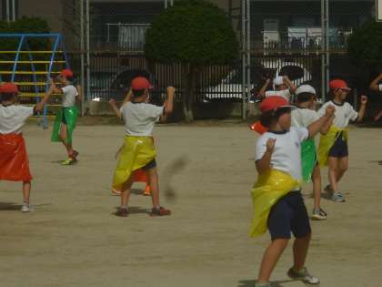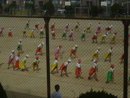 2時限目、3・4年合同による団体演技の練習がありました。運動場で初めて衣装を着けての演技となりました。