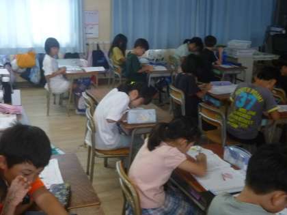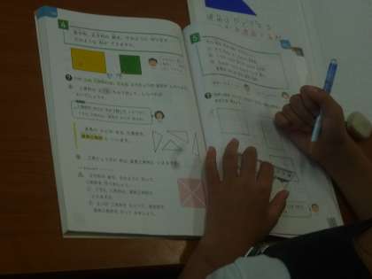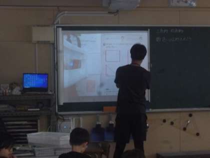 三角定規やさしを使って、方眼紙に三角形や四角形を書いていきました。きれいな長方形、正方形、直角三角形ができあがりました。