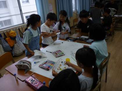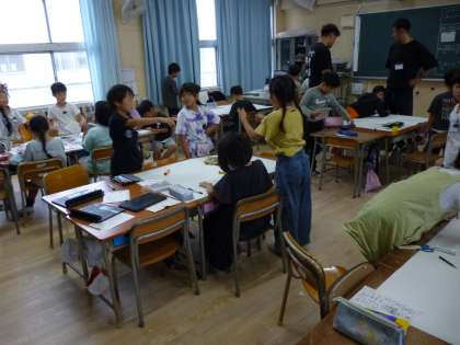 3日の「まちたんけん」での聞き取りや写真をもとに、新聞づくりをしています。