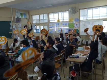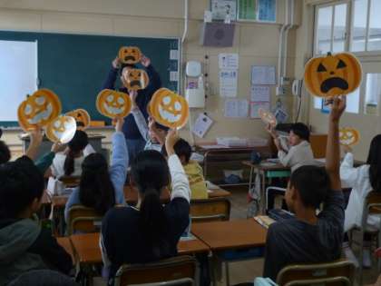 31日に行われるハロウィンに関連して、「パンプキン トーク」をしました。パンプキンの顔で意思表示をしたりエイリアンやピエロ・ドクロを見つけたりしました。
