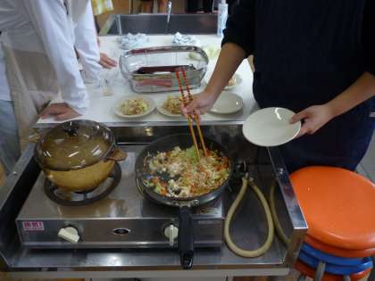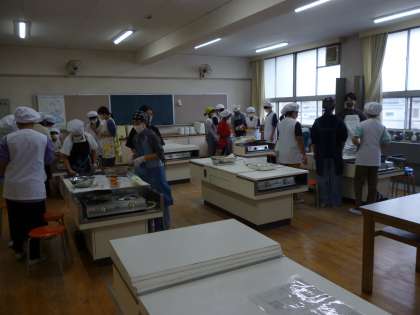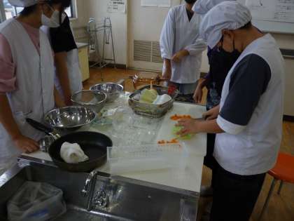 1・2時間目、家庭科室で野菜を切ったりお米を炊いたりみんなで協力して調理しました。最後は盛り付けして出来上がりました。(3・4時限目は1組)