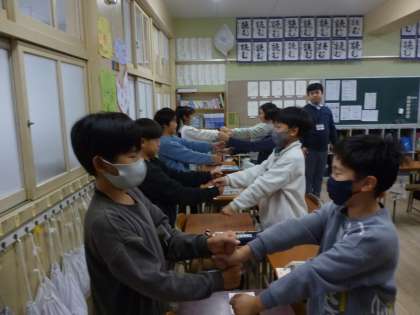 二人向かい合って、こぶしを上に乗せたり下にしたり引いたりするゲームで、歓声が上がっていました。