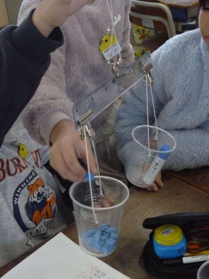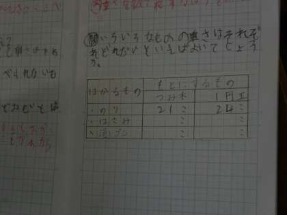 グループごとに協力しながら、自分の持っている「のり、はさみ、消しゴム」の重さを積み木(ブロック)や1円玉の数ではかってみました。