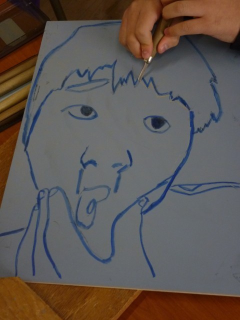 表情豊かな自分の顔を、彫刻刀の使い方に注意しながら掘っていました。