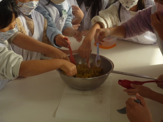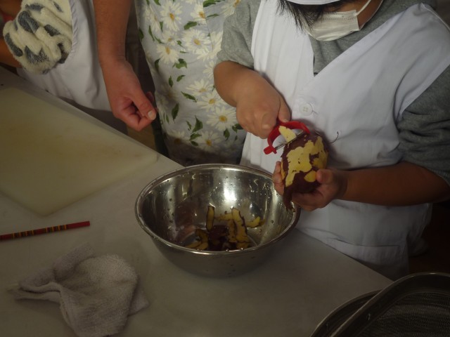 皮をむいてつぶして作ったきんとんができ、教室に戻って食べました。