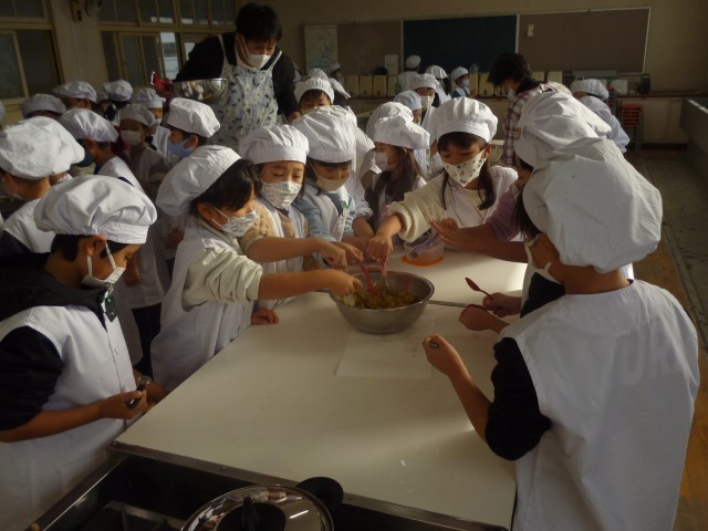 1・2時限目、家庭科室で「おいもパーティー」をしました。